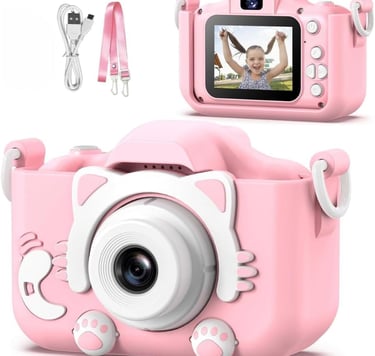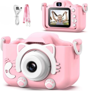 Câmera Digital Infantil com design fofo de gatinho rosa para crianças, com interface amigável, navegação fácil e construção durável, perfeita para mãos pequenas.